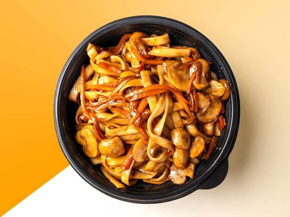 Лапша удон, морковь, грибы, терияки соус, кунжут, соевый соус.