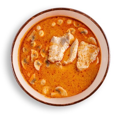 Креветка тигровая, черри, грибы, рис, кокосовое молоко, лист лайма, лемонграсс, лук парей.